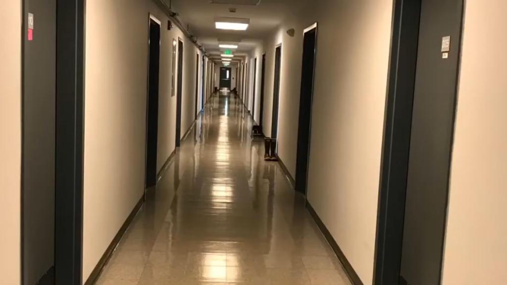 After work, employees staying in bunkhouses must walk down hallways.