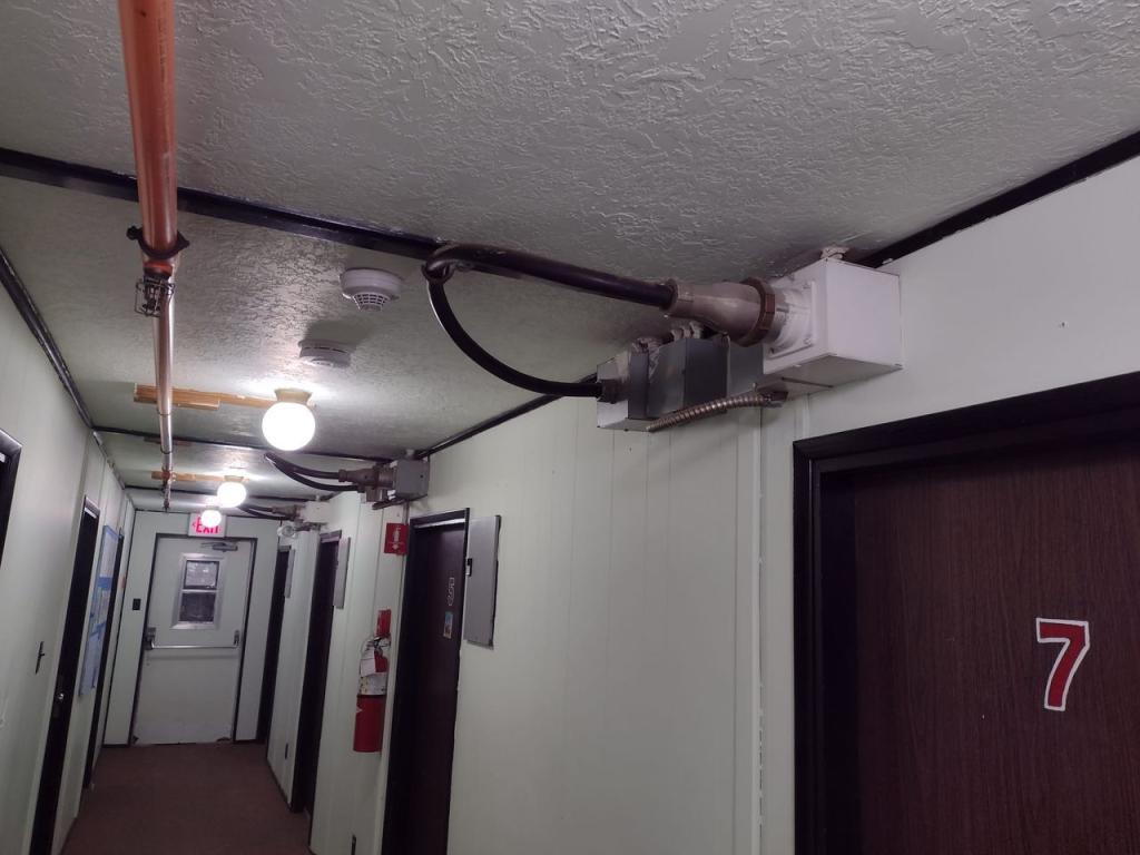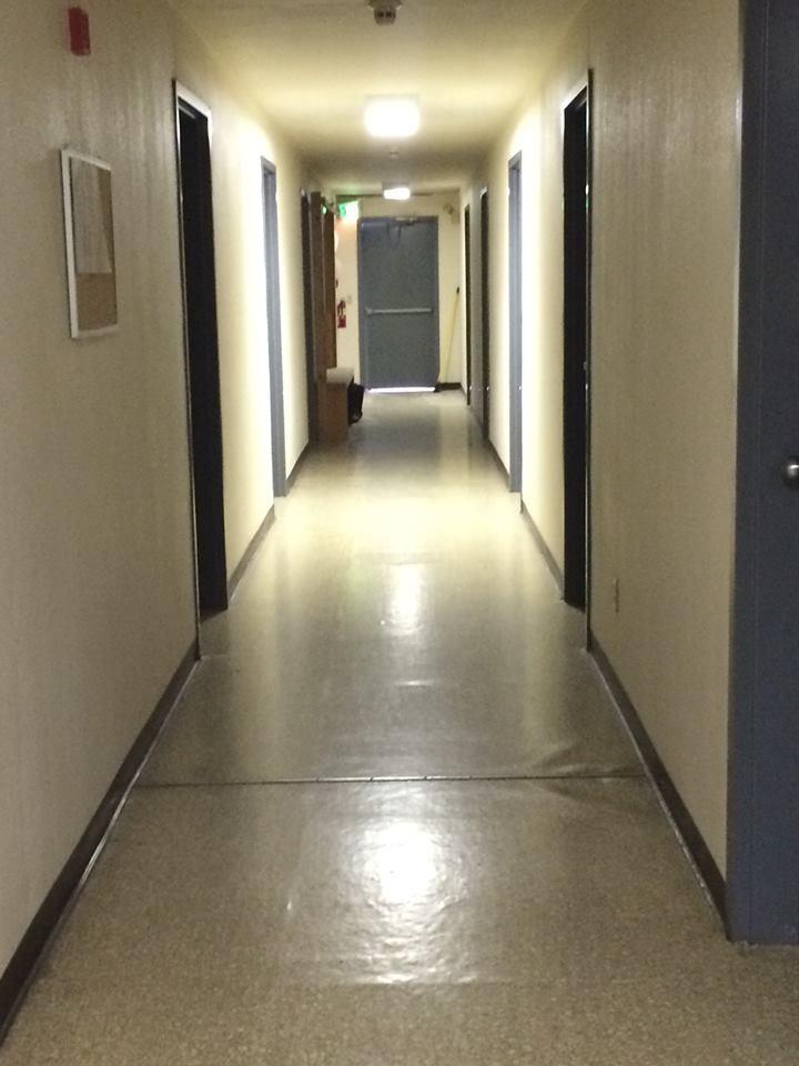 After work, employees staying in bunkhouses must walk down hallways.